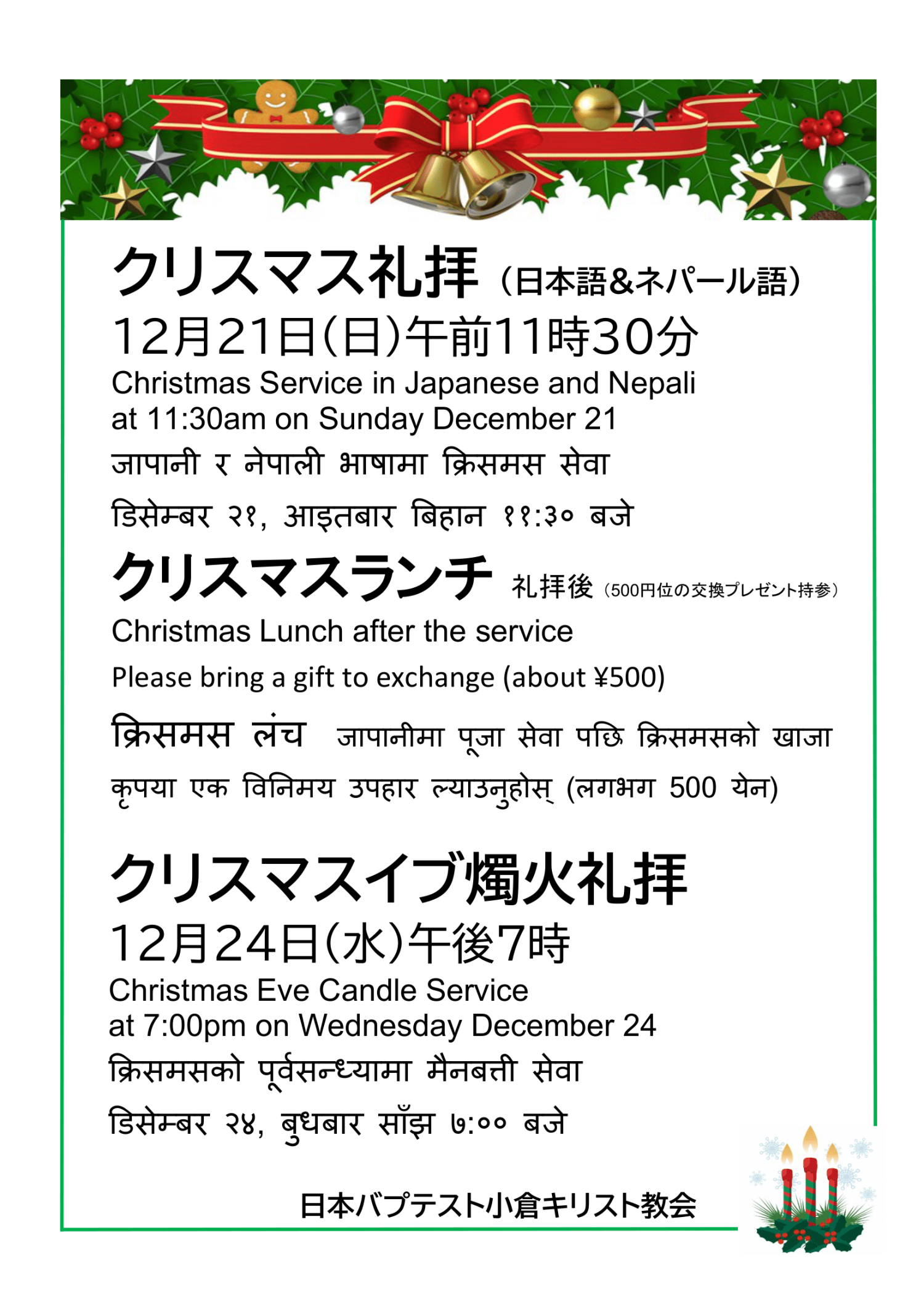 ★小倉教会の礼拝では、新共同訳聖書と新生讃美歌を用います。礼拝は受付でお配りする「週報」に記載されているプログラムに沿って進行しますので、どなたでも参加することができます。その外で分からないことは、ご遠慮なく受付の者にお尋ね下さい。